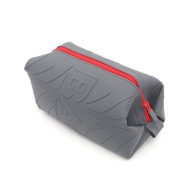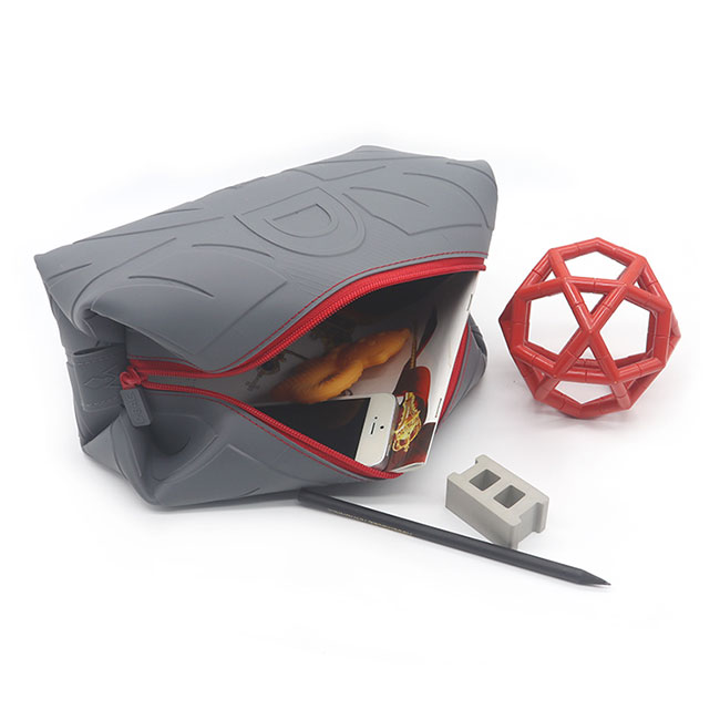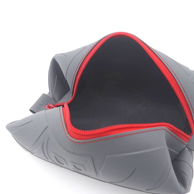 創(chuàng)意定制化硅膠收納包,此款主要設(shè)計年輕為主題,灰色為主加上紅色的點綴,邊邊的圖案花紋使收納包更加的年輕化和時尚。